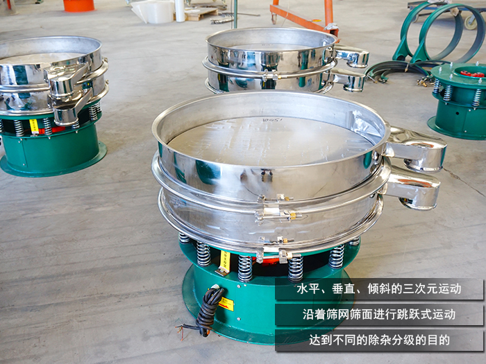 橡膠粉一般分為粗膠粉0.425mm(40目)以上、細(xì)膠粉0.425mm—0.180(40—80目)、微細(xì)膠粉0.180—0.075mm(80—200目)。DH系列旋振篩通過立式振動電機(jī)作為振動源,在篩分過程中將電機(jī)的旋轉(zhuǎn)運(yùn)動轉(zhuǎn)變?yōu)樗健⒋怪薄A斜的三次元運(yùn)動,再把這個(gè)運(yùn)動傳遞給上端的篩面進(jìn)行橡膠粉篩分。將篩分的橡膠粉沿著篩網(wǎng)篩面進(jìn)行跳躍式運(yùn)動,再通過篩面上不同尺寸大小的網(wǎng)孔分級過網(wǎng),以達(dá)到不同的除雜分級的目的。篩網(wǎng)層數(shù)高可達(dá)到5層,可滿足不同規(guī)格的分級除雜。