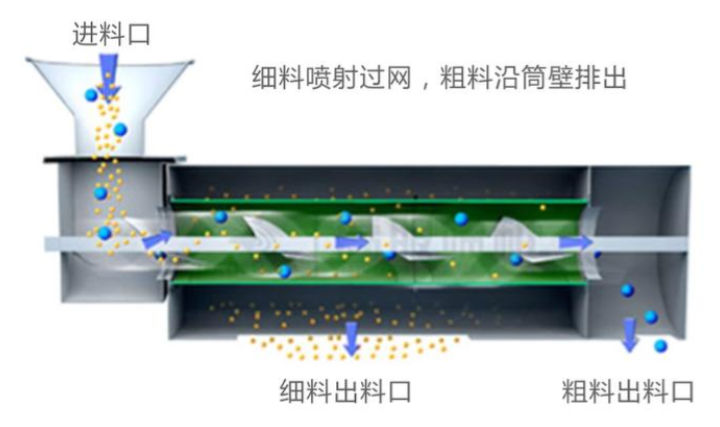 WQS氣旋篩由于形狀為橫臥狀所以也叫臥式氣流篩或臥式氣流篩分機(jī) ,網(wǎng)為圓筒狀,置于機(jī)體內(nèi),物料通過(guò)螺旋輸送系統(tǒng)后,和氣流混合、霧化進(jìn)入網(wǎng)筒內(nèi);通過(guò)網(wǎng)筒內(nèi)風(fēng)輪葉片使物料同時(shí)受離心力和旋風(fēng)推進(jìn)力,從而近使物料噴射過(guò)網(wǎng),由細(xì)料排出口排出,不能過(guò)網(wǎng)的物料沿網(wǎng)筒壁從粗料排出口排出。