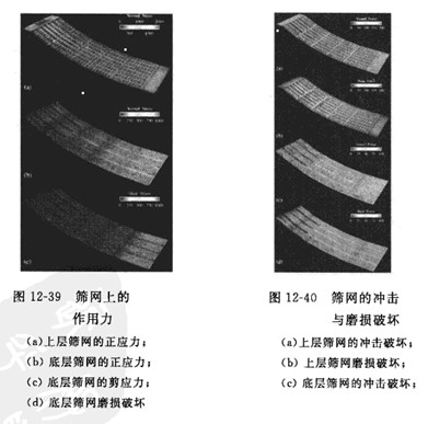 振動(dòng)篩篩分的DEM仿真結(jié)果可以用于分析顆粒群再篩網(wǎng)上的松散度、振動(dòng)強(qiáng)度、料層厚度、篩孔孔徑和篩面傾角等參數(shù)對(duì)分離粒度及篩分效率的影響及相互作用。顆粒群再篩網(wǎng)上的流動(dòng)平衡、顆粒對(duì)篩網(wǎng)的沖擊速度計(jì)施加在篩網(wǎng)上的載荷也能通過DEM仿真結(jié)果獲得,從而確定篩網(wǎng)所受的應(yīng)力、篩網(wǎng)的磨損及篩分裝置的功率、圖12-39和圖12-40分別為Yuan等人通過DEM仿真獲得的篩網(wǎng)上的作用力圖和篩網(wǎng)的沖擊與磨損破壞圖。