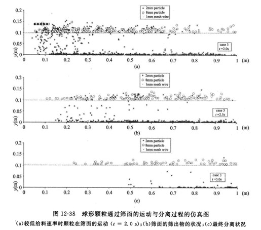 DEM仿真的過程信息能夠在線不同篩分工作條件下顆粒再篩面的運(yùn)動(dòng)、顆粒同篩面之間的碰撞過程、顆粒通過篩網(wǎng)的分離過程,反映了不同力度顆粒在篩面上運(yùn)動(dòng)形態(tài)的差異,再現(xiàn)不同振動(dòng)篩分機(jī)工作條件下顆粒運(yùn)動(dòng)過程,較為真實(shí)的描述顆粒同篩面之間的碰撞過程。圖12-38為L(zhǎng)i等人模擬2mm和8mm球形顆粒通過篩面的運(yùn)動(dòng)與分離過程圖。